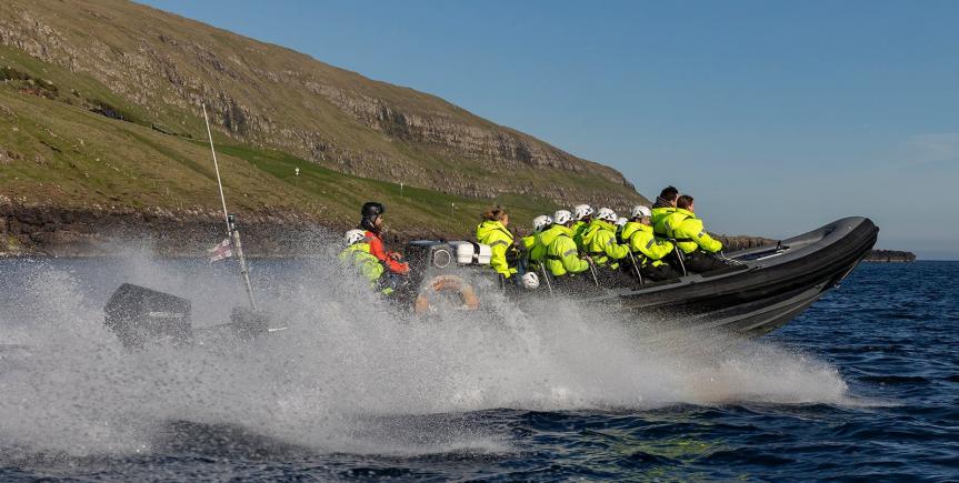 Tilkøb: RIB-boat. RIB-boat sejltur fra Gamlarætt og rundt om øen Hestur. En sejltur nærmest flyvende sejltur hen over vandet i en hurtigsejlede RIB-båd. Se det smukke syn af øen fra søsiden med imponerende klipper, grotter og fugleliv. Adrenalinkick og naturoplevelse! Pris: 1.300,- (min. 10 personer) inkl. varm dragt og transfer.