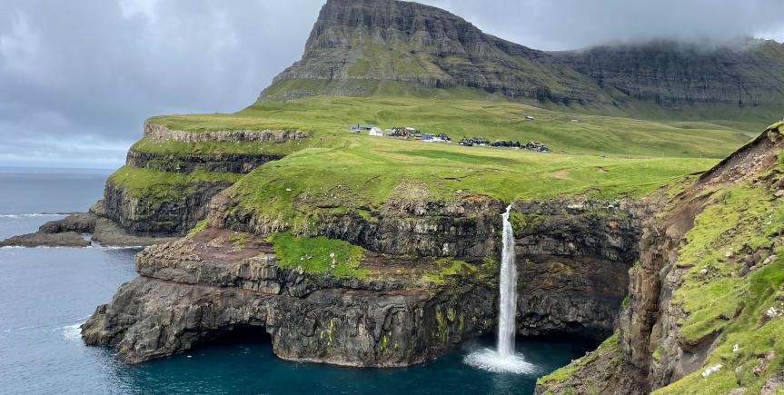 6. dag: Vagar - Hjemrejse. Efter morgenmaden tjekker vi ud af vores værelser. Busturen går til den vestlige ø Vágoy. Her venter endnu en dag i naturens tegn. Vi besøger den lille bygd Gåsedalen med det imponerende vandfald Múlafossur – ét af de mest ikoniske udsigtspunkter på Færøerne. Vi går en tur i Bøur, som er en hyggelig bygd med fantastisk udsigt mod Tindhólmur og Drangarnir. I dag er frokosten (inkluderet) på et lille sted med lokale delikatesser i autentiske omgivelser. Herefter retur til hotellet, hvor vi får vores bagage og kører til havnen og går ombord på Norrøna. Indkvartering og aftensmad ombord.