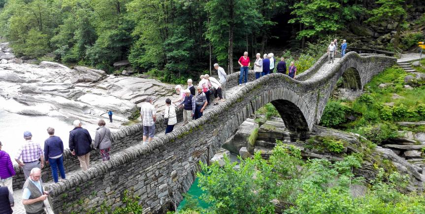 5. dag: Varzesco Dalen - Lugano. Gennem millioner af år har den lille Vorgogno-flod banet sig vej gennem bjergene ved nordenden af Maggioresøen og skabt en enestående smuk dal. Vi kører en tur op gennem de små landsbyer i dalen, hvor husene er bygget af den lokale grå sten. Et højdepunkt på turen er den gamle bro "Ponte dei Salti", der i århundreder har bragt fodgængere sikkert over floden. Der vil også blive tid til en pause ved den høje dæmning nederst i dalen, hvorfra man har en betagende udsigt over Alperne. Efter flotte naturoplevelser kører vi videre til byen Lugano, som ligger smukt ved Luganosøen. Vi går langs Luganosøen af den palmeklædte strandpromenade ind til Lugano centrum. Her vil der blive tid på egen hånd til at se sig om i byen, beundre de flotte gamle badehoteller eller nyde udsigten over søen.