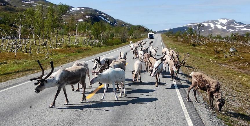 7. dag: Norge. Vi kører tilbage til fastlandet, og følger nu en smuk tur ned langs den norske vestkyst. Vi kommer over Skaidi til Alta, der er handelscentrum for lapperne. Her findes desuden et af verdens største helleristningsfelter, som der gøres pause ved (entre). Vi overnatter i Tromsø. Dagsetape ca. 500 km.